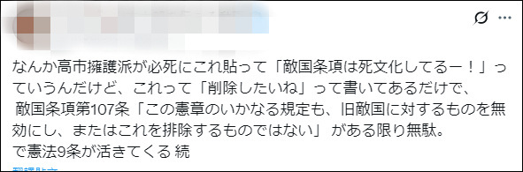 “高市早苗的支持者们拼命贴出当年的联合国决议,称‘敌国条款’已死,但(决议)上面只是写‘我想删除它’。只要联合国宪章第107条继续存在,就是白费功夫……”