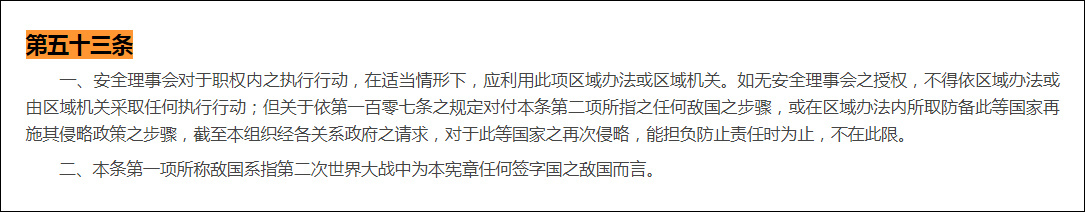 “敌国条款”即《联合国宪章》第53条、第77条和第107条相关内容。规定德意日等法西斯或军国主义国家的任何一国有再次实施侵略政策的任何步骤,中法苏英美等联合国创始成员国有权对其直接实施军事行动,无须安理会授权。